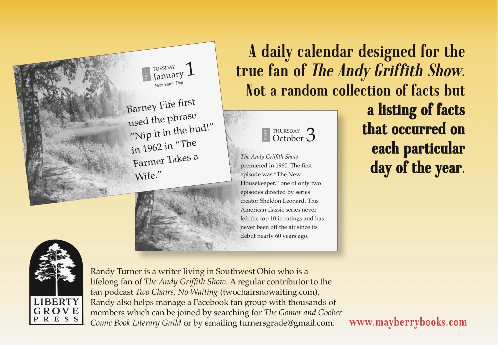 Our first publication, the 2019 Mayberry Day-by-Day Flip Book Calendar, is in stock and ready to ship beginning this coming week! To order online and have them signed (and personalized, if desired), visit https://mayberrybooks.com/product/2019-mayberry-day-by-day-flip-book-calendar/ to use our secure shopping cart to pay by credit card or check. If you are attending Mayberry Days, there are a couple of other signing options as discussed below.