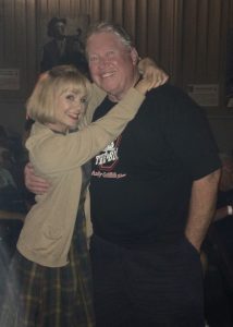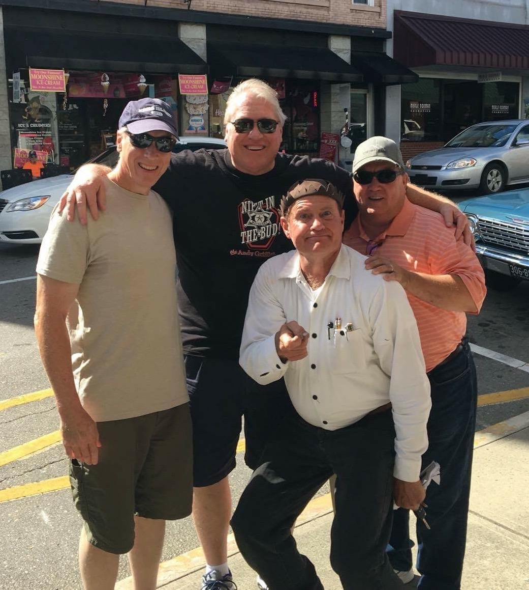 When I attended Mayberry Days in 2016, I gave Allan Newsome one of our chapter t-shirts. Allan is well-known in the Mayberry community as the tribute artist who acts as Floyd the barber at Mayberry events. Allan has often served as the Mayberry Deputy David Browning’s righthand man when David served as an emcee and has assumed many of David’s duties now that David is no longer attending Mayberry Days. Allan is also the podcaster who hosts the fan podcast called Two Chairs, No Waiting, the title of which is a reference to Floyd Lawson’s dream shop. He has been doing a weekly podcast since October 2008 and on October 16, 2018, posted his 5ooth episode. The gift of a shirt was just a small token of thanks to Allan for all he does to keep the Mayberry spirit alive.