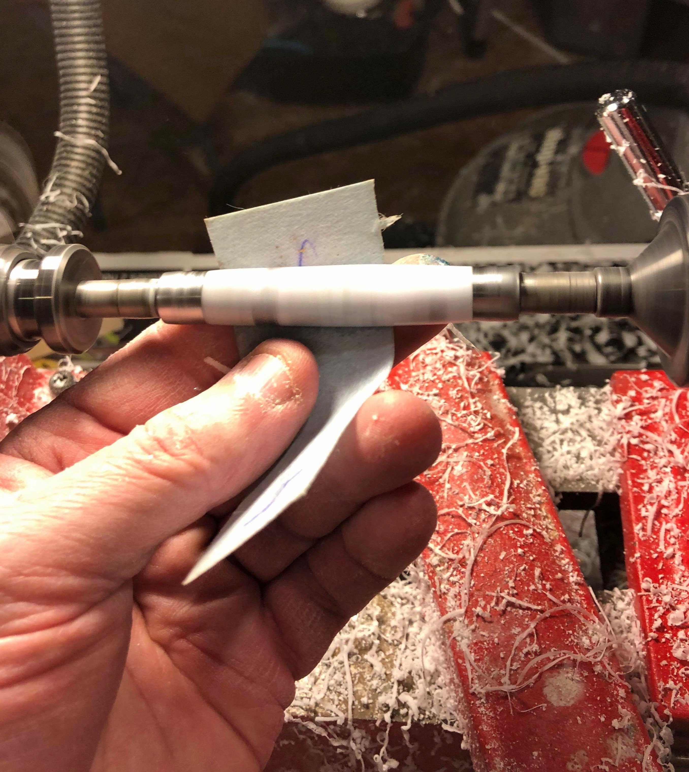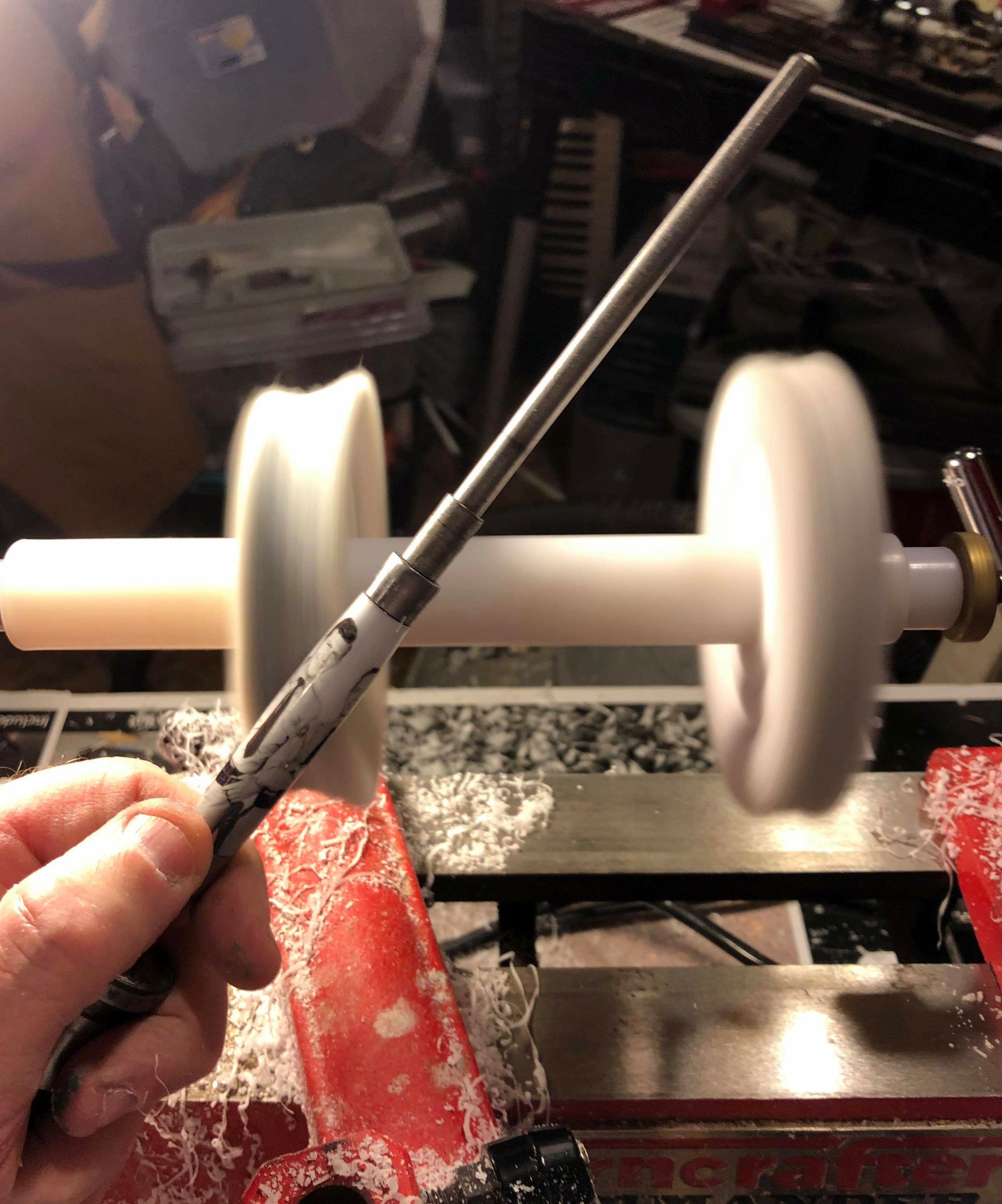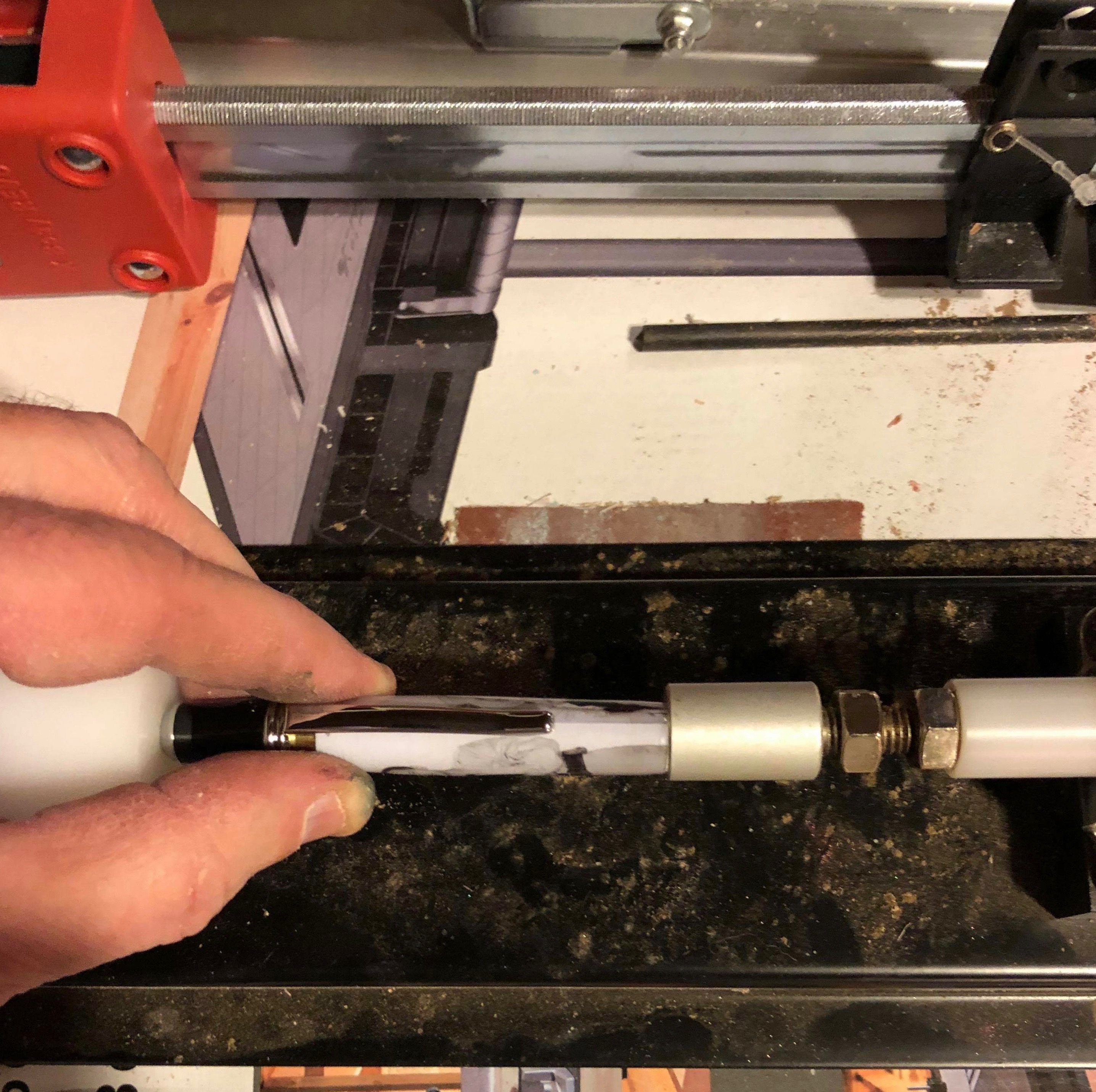 The chamber of these pens begins with what is known as a “blank.” The pen starts with a block of acrylic, a special polymer that can be cut, turned on a lathe, and polished. After the center is marked and drilled through the middle. the block is turned on a lathe and formed into the pen chamber.
