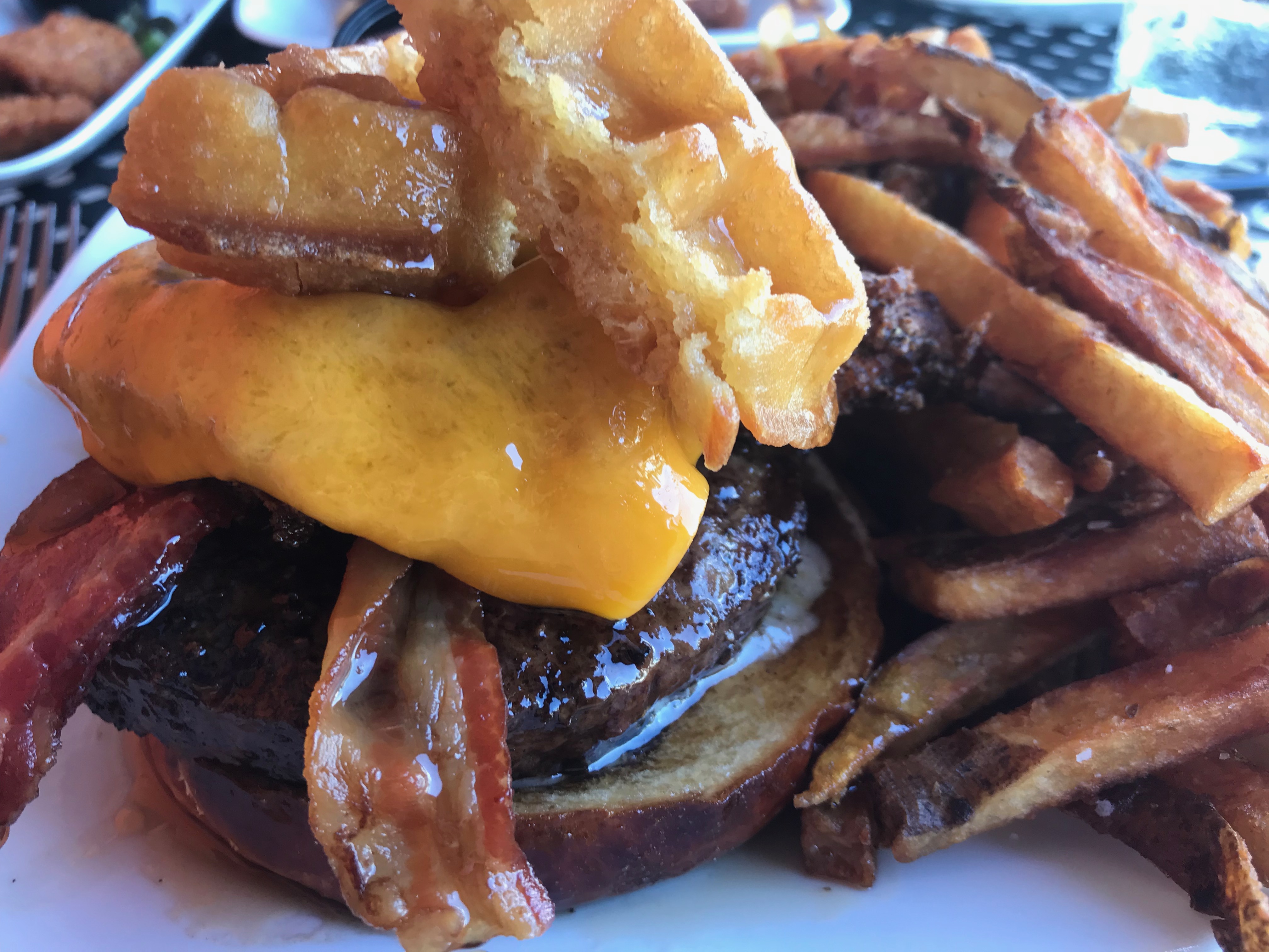 While Taste of Belgium is more known for their sweet waffles and great brunches, they do make an excellent burger. What truly makes it distinctive visually is it is not served on a bun. Nor is it served on their normal waffles. Instead, waffles made from cheddar grits cooked in the waffle iron take the place of a bun. The burger patty is not just ground beef. It is a blend of short rib, brisket, and chuck. The meat is topped with bacon, goat cheese, and caramelized apples and shallots. The sandwich is served with excellent fries, or—since we are talking about Taste of Belgium—frites. Like all Belgian fries, the potato slices are double fried.