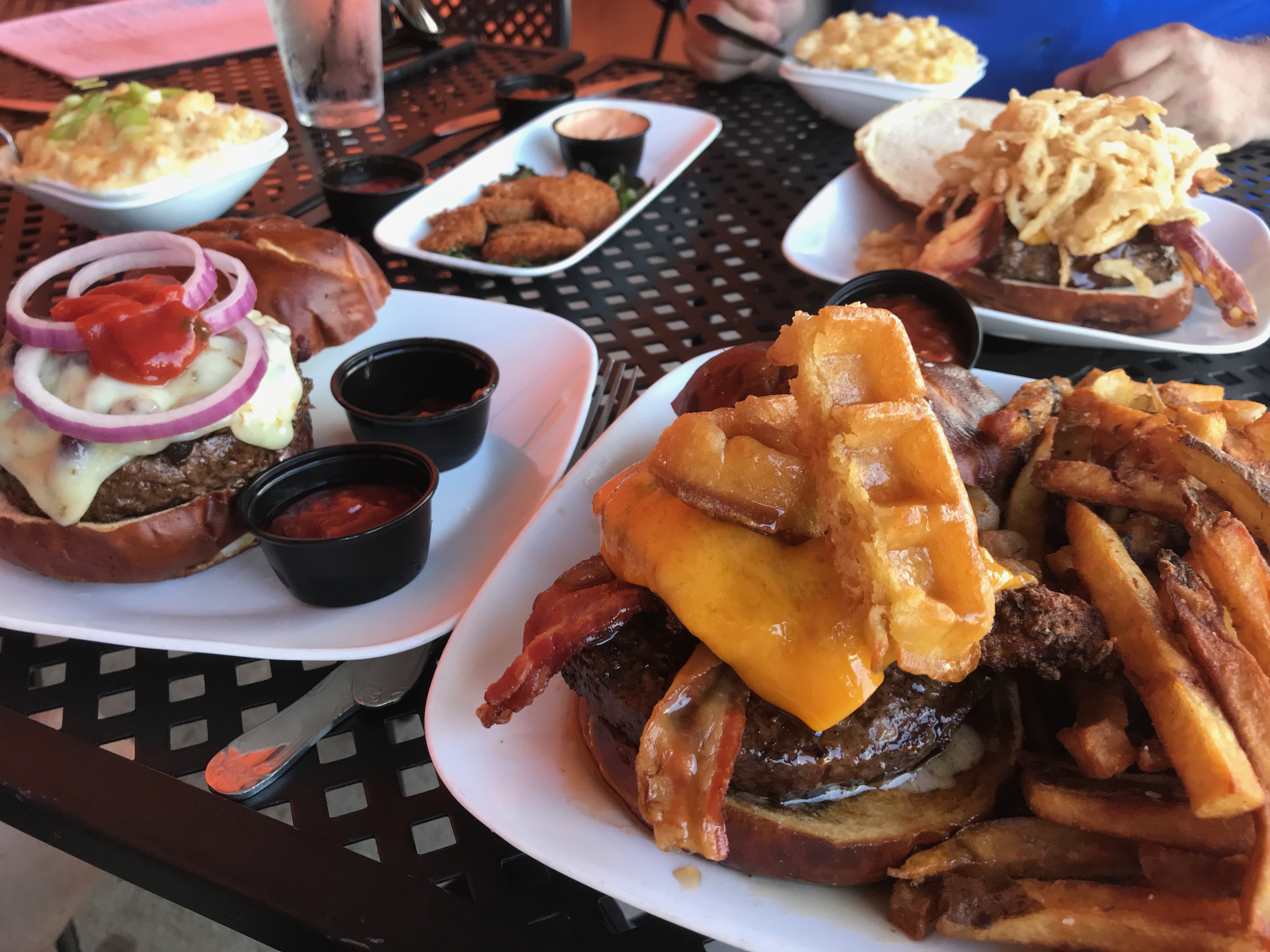 The burger I have not been brave enough to try, but undoubtedly will on a day when I am really hungry, is the Hangover burger. This monstrosity—and I mean that in a good way—is topped with smoked gouda, smoked sausage, cheddar, Canadian bacon, American cheese, smoked bacon, fried onion strings, and a Chipotle BBQ mayo!