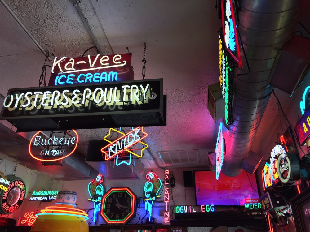 Certainly, a large factor in the restaurant’s popularity is its garish and kitsch decor. The outside is absolutely covered in neon signs from various other businesses and the inside is no different. It is filled with neon as well as vintage beer posters and enormous beer coolers made in the 1950s that hold 264 cases of beer each in their refrigerated interiors. The place is a feast for the eyes as much as the food is a feast for the stomach. Their self-description is “a quirky joint doling out beers and jumbo burgers with adventurous toppings in a neon-lit room.”