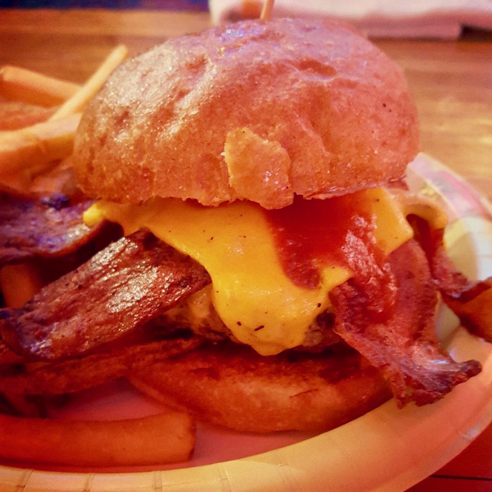 The burgers are usually served with fresh-cut fries but they also offer mac & cheese, onion rings, or fried corn on the cob.