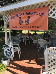 The second evening, food was ordered in and everyone ate together around the gazebo. A group photo was taken followed by more trivia until Mother Nature decided to attempt to spoil the evening with lightning in the distance. Everything was hastily disassembled, folding chairs were put away, and that could have been the end of the evening. Instead, roughly 25 of us stayed outside sitting in the gazebo while the rain gently fell and just had an evening of fellowship. Allan told stories of experiences he has had as a result of being the Floyd tribute artist and spoke about his podcast. At one point, Dewey started a round of people each giving one of their favorite lines. Mine? It’s impossible to pick a true favorite but I have always been amused by a more obscure line delivered flawlessly by Don Knotts in Season 1. Upset with Andy, Ellie Walker said she would go to the church picnic with the first man to walk into the drugstore. When Barney walked in he was taken aback when Ellie authoritatively told him that he would be escorting her to the picnic. Afterward, he looked stunned and said, “I just come in for some foot powder.”