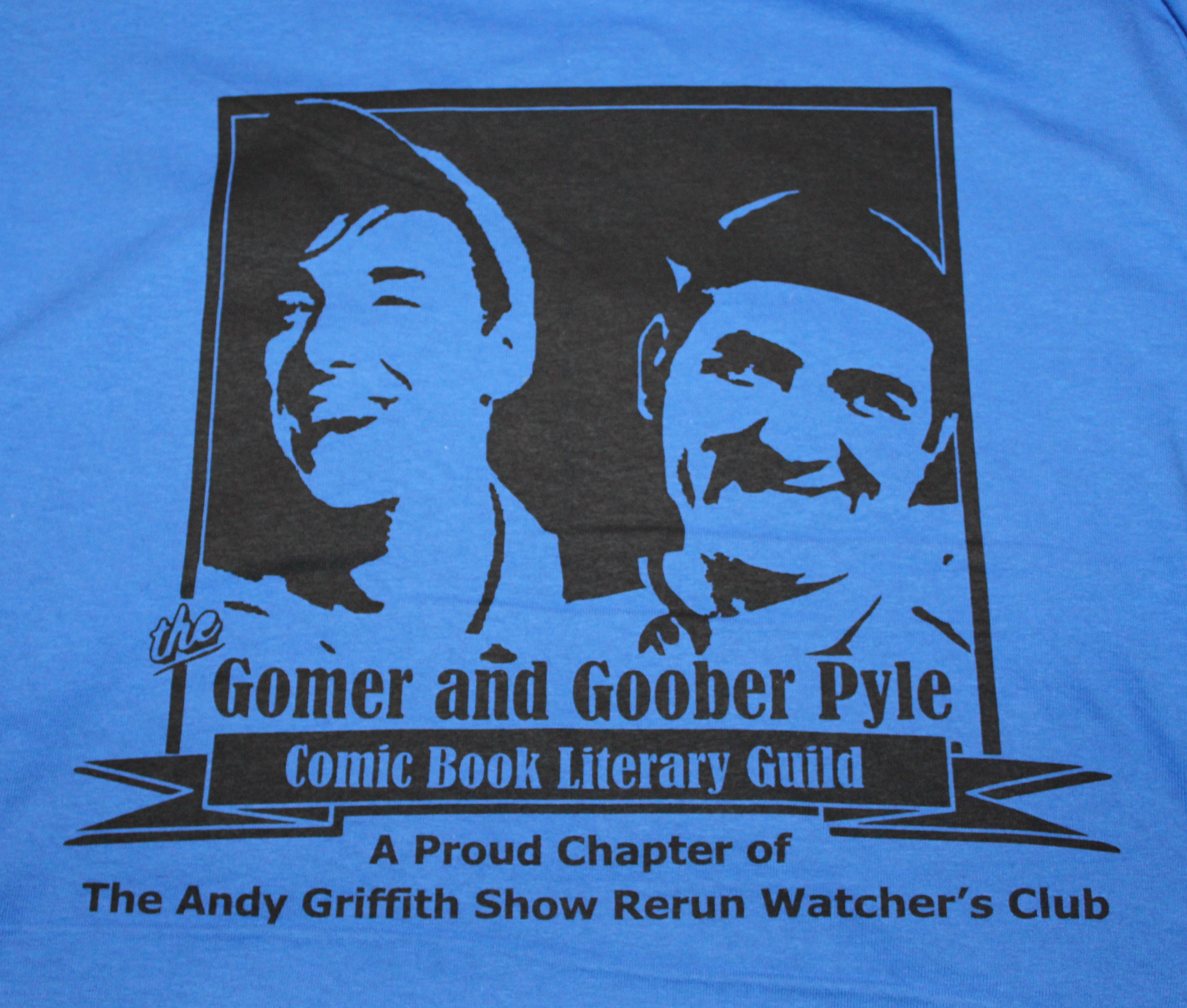 Dick did not pursue it as his primary career, but he is a talented graphic artist. Having seen various club chapters sporting t-shirts at Mayberry Days the previous year, I asked Dick if he could come up with, in essence, a logo for our chapter, The Gomer and Goober Pyle Comic Book Literary Guild. He agreed to do so. I designed the basics of the logo but Dick created the artwork and brought it all together.